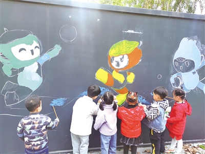 春日暖阳洒在稚嫩的孩童身上,身边五颜六色的画笔,墙上勾勒的亚运吉祥物……近日,复兴南苑的运动公园人潮涌动,这里正在举办“欣欣向荣志愿行,亚运文化共建设”活动。在大家一笔一画地勾勒、填充下,逐渐呈现的画面吸引了许多过往的居民驻足欣赏。