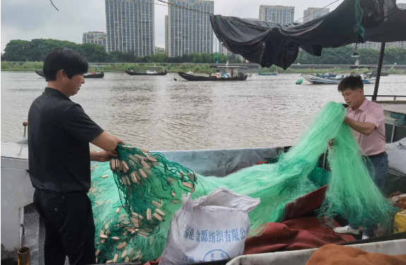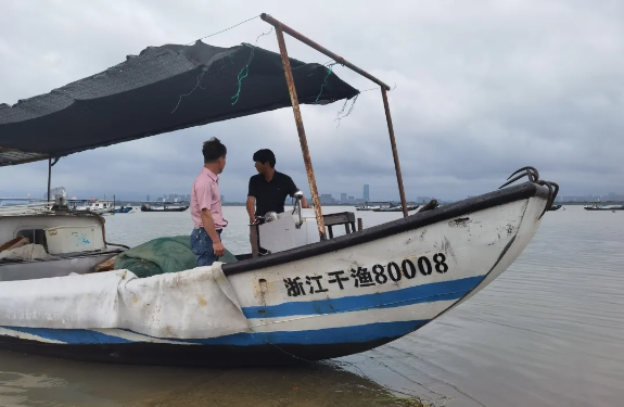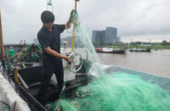 豆大的雨滴击打在钱塘江面,激荡起朵朵水花。昨天上午,冒着雨,王林海和金小明一起划桨至江心,小船换大船,兴致勃勃地检查渔具和装备。