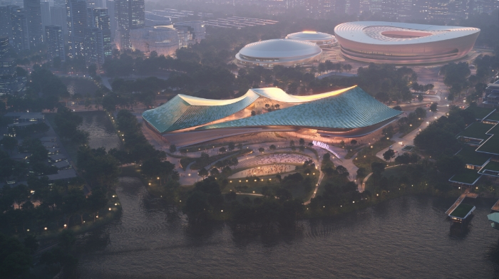 不仅是功能上,光从设计来看,杭州未来国际演艺中心也拥有“顶流”潜质:建筑设计的灵感来源是丝绸,色彩用的是宋画碧青,造型则以山为形。