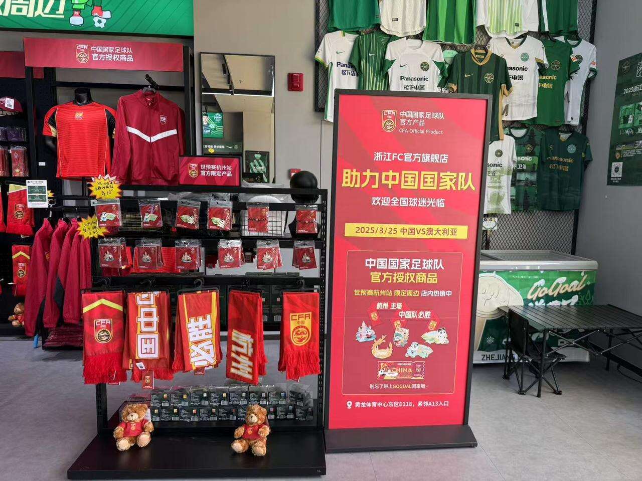“中国队的球衣还有吗?”赛前一周,位于杭州黄龙体育中心的浙江FC官方旗舰店(球队周边商店)内,类似的焦急问询不断在店内响起,询问者大多都是来杭州看比赛的球迷,计划为25日观赛添置应援“设备”。记者现场看到,店铺门口张贴有醒目的世预赛杭州站限定周边海报,走进店内,陈列着“杭州主场”限定围巾、“三潭印月”主题徽章等多款赛事周边十分醒目,除了周边外,门店还提供球衣印制服务。