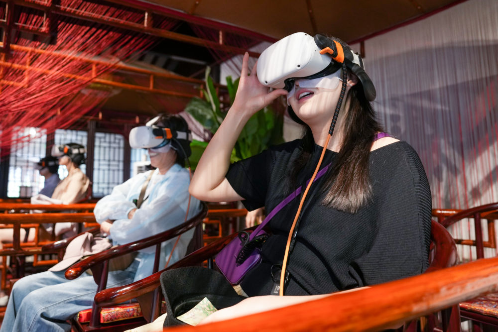 2025年5月18日,游客在江苏苏州拙政园体验VR漫游。近年来,苏州不断推进“数字园林”建设,在园林整体数字建模、园林要素数据库建设等方面开展探索,利用数字技术创造“数字云游”VR场景,打造“云游拙政园”“狮林园宇宙”“留园虚拟元宇宙”等项目,营造真实可感的虚拟空间,让观众沉浸式感受苏州园林的独特魅力。