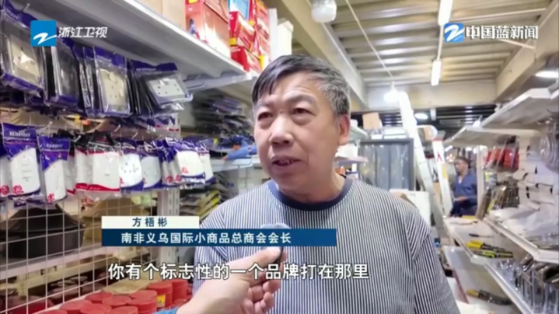 南非义乌国际小商品总商会会长 方梧彬:义乌那边如果有家乡的人跟我们来合作搞个一个品牌,同样的东西,你有个标志性的一个品牌打在那里,它可以价格提高20%。
