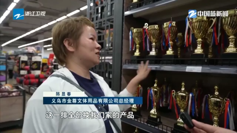 义乌市金尊文体用品有限公司总经理 陈显春:我们结合市场上看到了一些回去,那工作的落地会更加方便顺利一点。争取下次过来,这一排全部换我们家的产品。