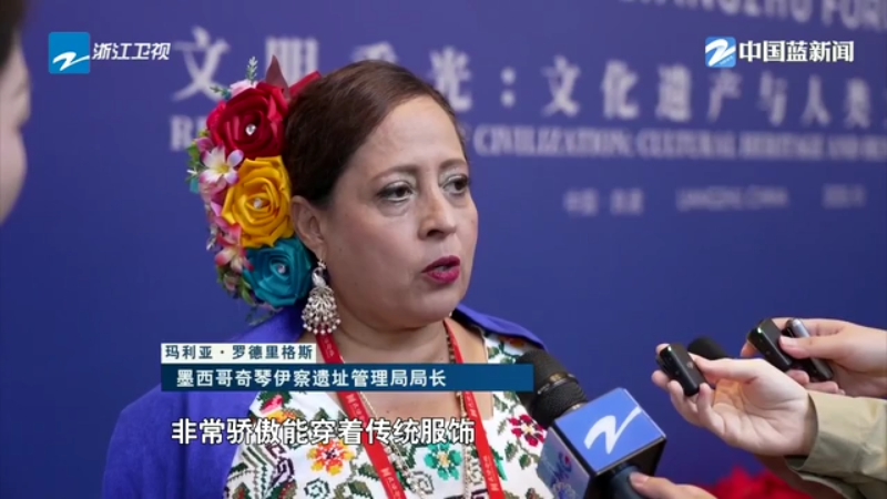 墨西哥奇琴伊察遗址管理局局长 玛利亚·罗德里格斯:非常骄傲能穿着传统服饰,来到这个文化交流的国际性平台。像这些图案和织法凝结了几千年的历史文化,希望能够促进玛雅文明与良渚文明的深度合作交流。