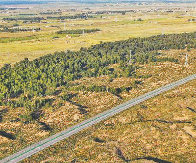 “十四五”时期,“三北”工程攻坚战取得阶段性成效。图为内蒙古库布其沙漠北缘锁边林带。新华社记者 李志鹏摄