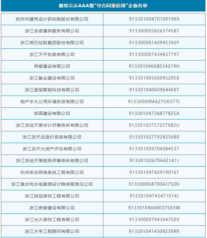 “守合同重信用”企业公示,是市场监管部门依企业自愿申请,对符合公示条件企业前两个年度内的合同履约信息向社会公示的行政指导行为。企业符合《浙江省“守合同重信用”企业公示办法》所规定的申报条件,合同制度健全、管理规范,履行合同诚信规范,守法经营,效益良好,可以自愿申报AAA级“守合同重信用”公示企业。省市场监管部门在企业申报、系统自动测评、各地核实推荐、大数据比对和实地核查后,优中选优,公示本年度AAA级“守合同重信用”企业。