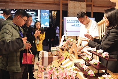步入文化特派员专题展区,深浅交叠的粉,成为最动人的视觉语言。展台上,以桃花为灵感的文创产品琳琅纷呈:蕴含中医药五行智慧的手串雅致脱俗;扭扭棒编织的桃花周边灵动可爱;而印着“隐山”意境的杯子,更是将一方山水诗意握于掌心……每一件展品,都在讲述皋城村如何把非遗底蕴、现代创意、中医药智慧,乃至“桃花运”的美好祈愿,巧妙地编织进一朵桃花的故事里。