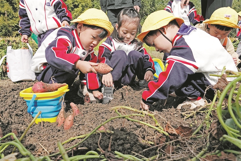 初秋时节,玉皇山南麓的八卦田里已是稻黄果香,不少小学和幼儿园组织孩子们秋游到此,在南宋皇家籍田里识五谷果蔬,体验挖番薯、割稻谷、刨花生、砍甘蔗等农事劳动,欢享丰收喜悦。