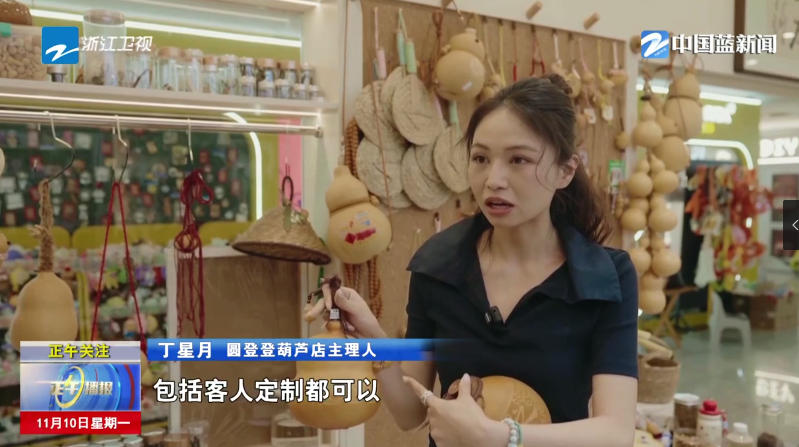 丁星月,义乌“商二代”,店铺里各类用葫芦做的文创产品,堆叠成一座“葫芦山”。一年前,丁星月打理的是一家少女风手串饰品店,有一天,妈妈梅冠春把一只葫芦塞进了她的货架。