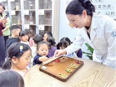 “大家看,我们的小手指上藏着健康开关哦!”中医师乔晓光举起右手示范,指尖轻点穴位。随着乔晓光用童趣语言讲解穴位知识,时不时与孩子们互动问答,小家伙们渐渐放松下来。从手指上的“健康密码”,到鼻尖萦绕的药香,中医生活馆的每一处都吸引着孩子们的目光。这种亲手触摸、亲口询问的直观体验,远比书本知识更生动,让中医药文化在孩子们心中留下深刻印象。