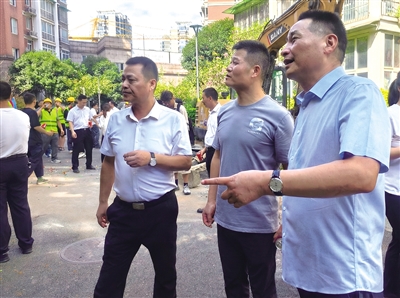 夏国强(右一)现场监督电梯加装工程