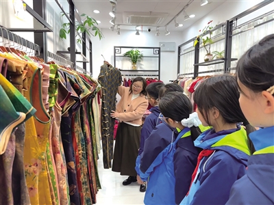 踏入四季青服装集团老市场的旗袍文化区域,孩子们即刻被精美雅致的旗袍吸引。张西琴细致讲解旗袍的剪裁工艺,从立领、斜襟、盘扣的设计智慧,到旗袍从民国至现代的演变历程,让孩子们对旗袍的发展脉络有了清晰认知。市场展区内,龙凤纹、牡丹纹等传统纹样成为鲜活的教学素材,松鹤纹象征长寿、锦鲤纹代表吉祥的文化内涵,通过讲解深深印入孩子们心间;孩子们还触摸真丝、宋锦、亚麻等不同面料,直观感受面料质地与旗袍风格的关联,在感官体验中积累传统服饰知识。
