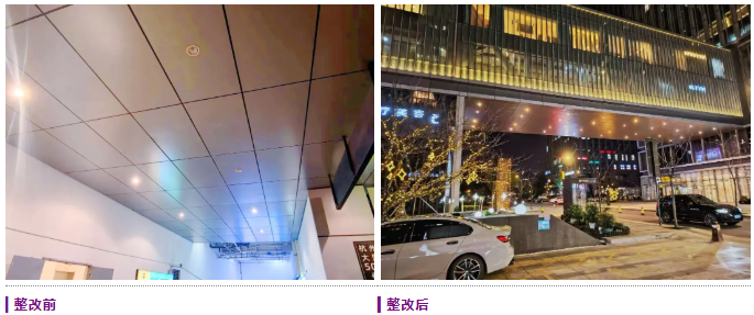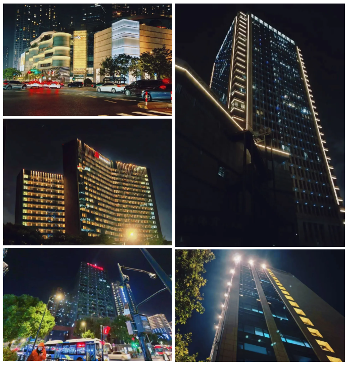 此次改造将西子国际501大厦135套老旧灯具全面替换为高显色性LED洗墙灯,并在建筑外立面加装智能调光轮廓灯,实现暖橙、明黄等色系及动态渐变效果切换。亮化升级后,楼宇照明效率提升40%以上,能耗降低近60%。