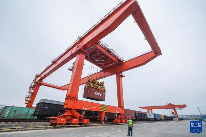 1月30日,在义乌铁路口岸,一列载着红酒、葵花籽油、气泡水等进口商品的中欧班列回程班列在卸货。