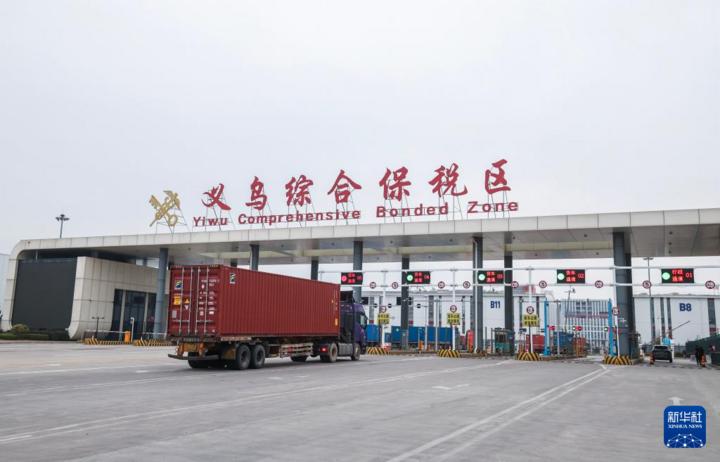 1月30日,一辆满载着进口商品的集装箱卡车进入义乌综合保税区进行保税仓储。