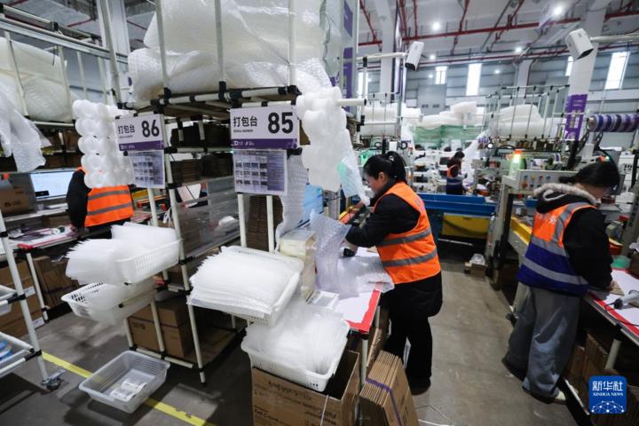 1月30日,义乌综保区跨境电商仓库的工人对完成海关申报的进口商品订单进行打包、张贴快递面单。