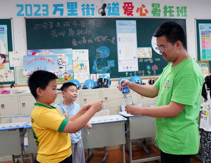 2023年暑假,上海市普陀区小学生爱心暑托班首次设立“新业态新就业群体子女专班”,招收新就业群体的子女,且不限上海学籍并减免一半费用,以缓解这些家庭的暑期“看护难”的问题。这是在上海万里城实验学校,小学生爱心暑托班“新业态新就业群体子女专班”的孩子们在和志愿者一起做游戏(2023年7月19日摄)。