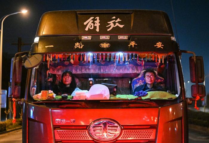 2025年1月13日晚,货车司机孔令建和妻子王艳青驾车行驶在浙江省杭州市的道路上。临近春节,他们通过平台获得一个送货到老家附近的订单,在工作的同时踏上了回家过年的团圆之路。