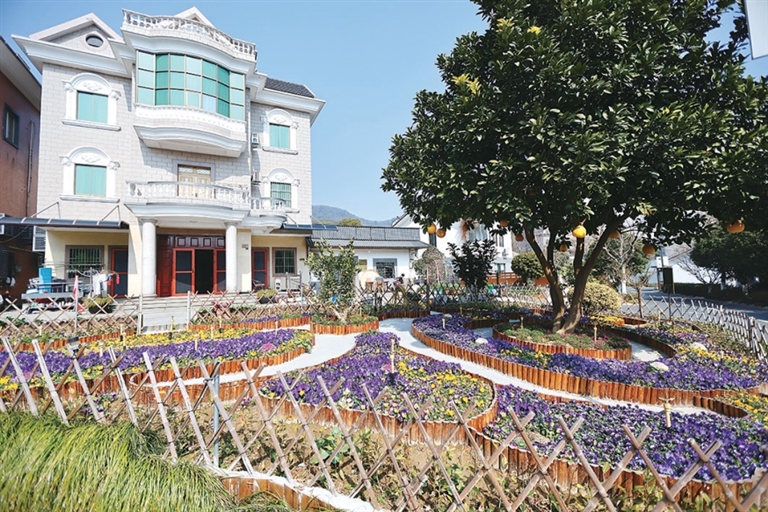 林世寿是郑盛苗的邻居,喜欢摆弄花花草草。他家的院落用竹篱笆围着,栽种着三色堇、龙井茶、香泡等植物,花池用木桩砌成元宝和铜钱形状。整个院落曲径通幽、错落有致,今年赢得了“精品庭院”奖。